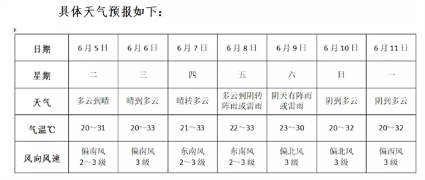 预计高考期间7日晴到多云,8-9日多云到阴转阵雨或雷雨,并可能伴有雷电大风等对流性天气,7-8日最高温度32-34℃,最低气温21-23℃,提请考生关注天气变化,提前做好防暑降温准备并备好雨具等。今天夜里到明晨大气扩散条件较差,部分地区有雾霾,注意交通安全。