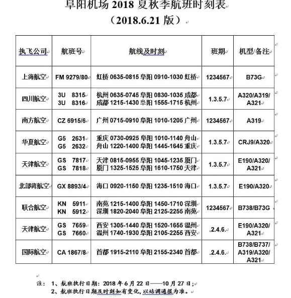 阜阳机场最新航班时刻表曝光!